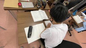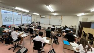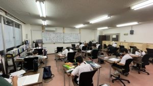 この写真のように入試問題集(一人一冊ずつ配布)をもとに入試演習を行います。