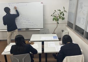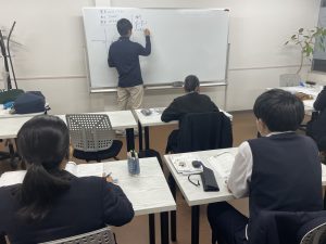 18:15~20:00で授業を行い、20:00~20:30はその日の授業で取り扱った内容の復習問題に取り組んでもらいます。中高一貫校では高1の終わりまでに数学ⅠA・ⅡBまでのほとんどの単元の学習が終わっているところが多いので、こちらの授業では数ⅠAの内容から、改めて定着を図ったりより入試に近いレベルの問題に取り組んだりしています。